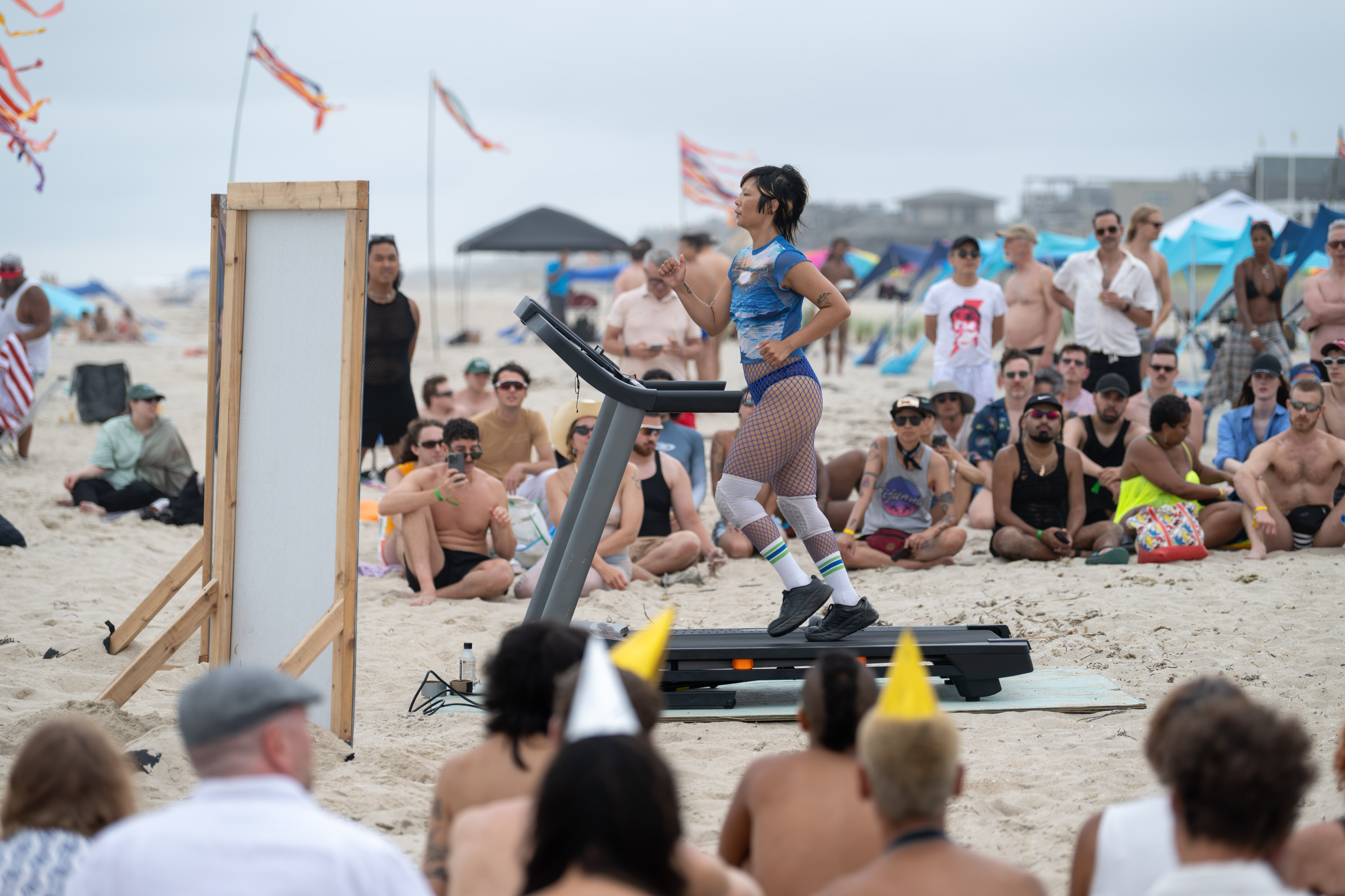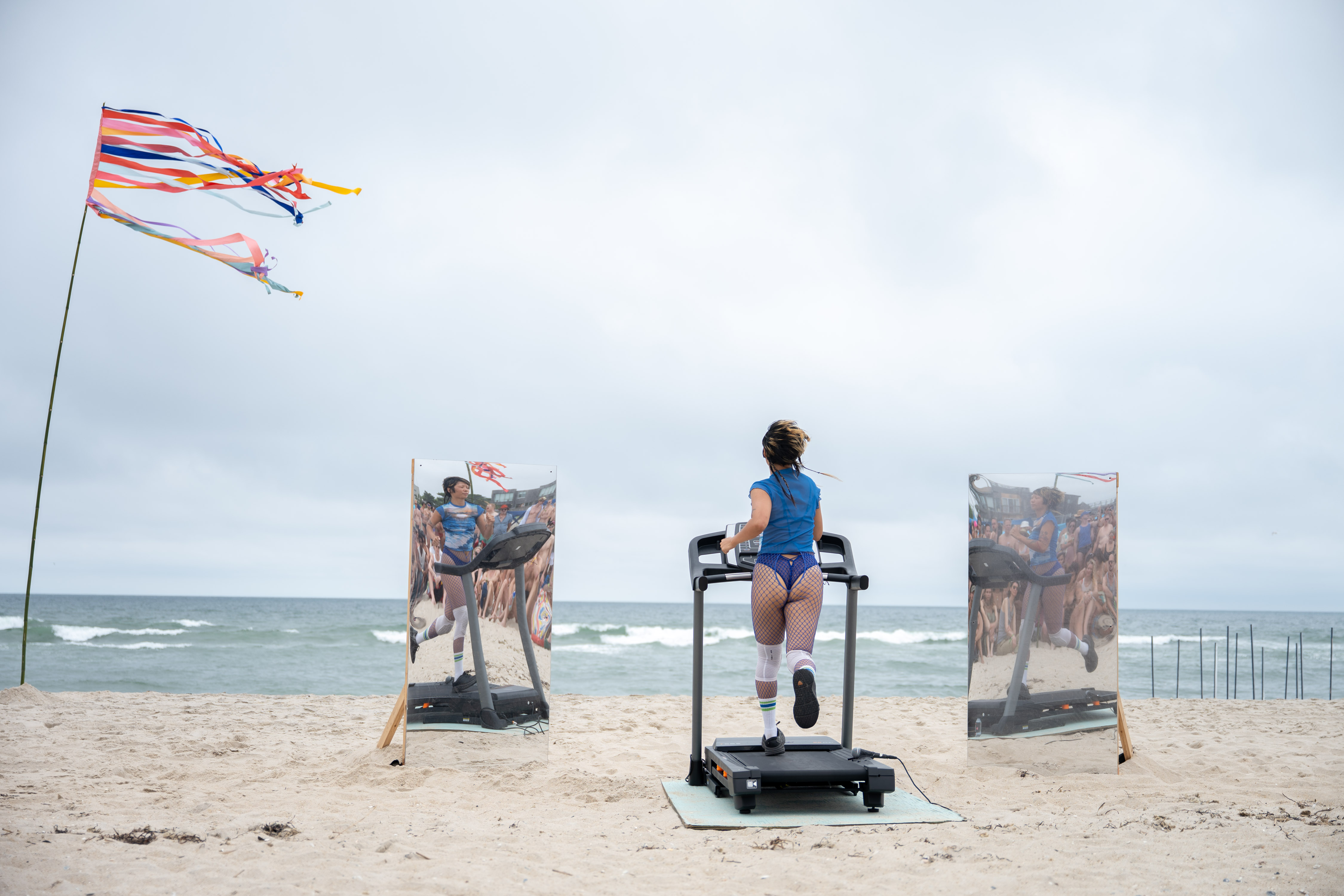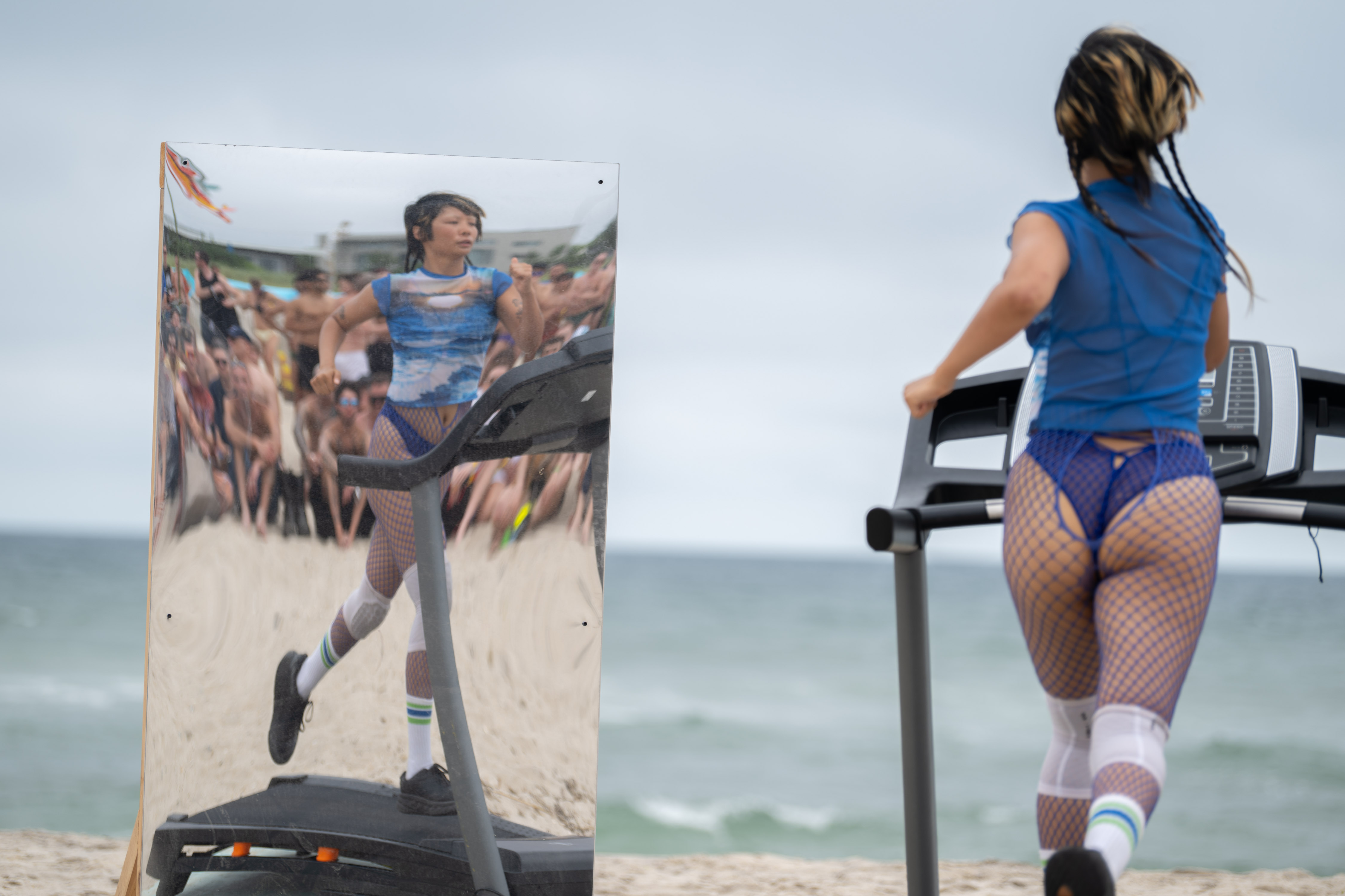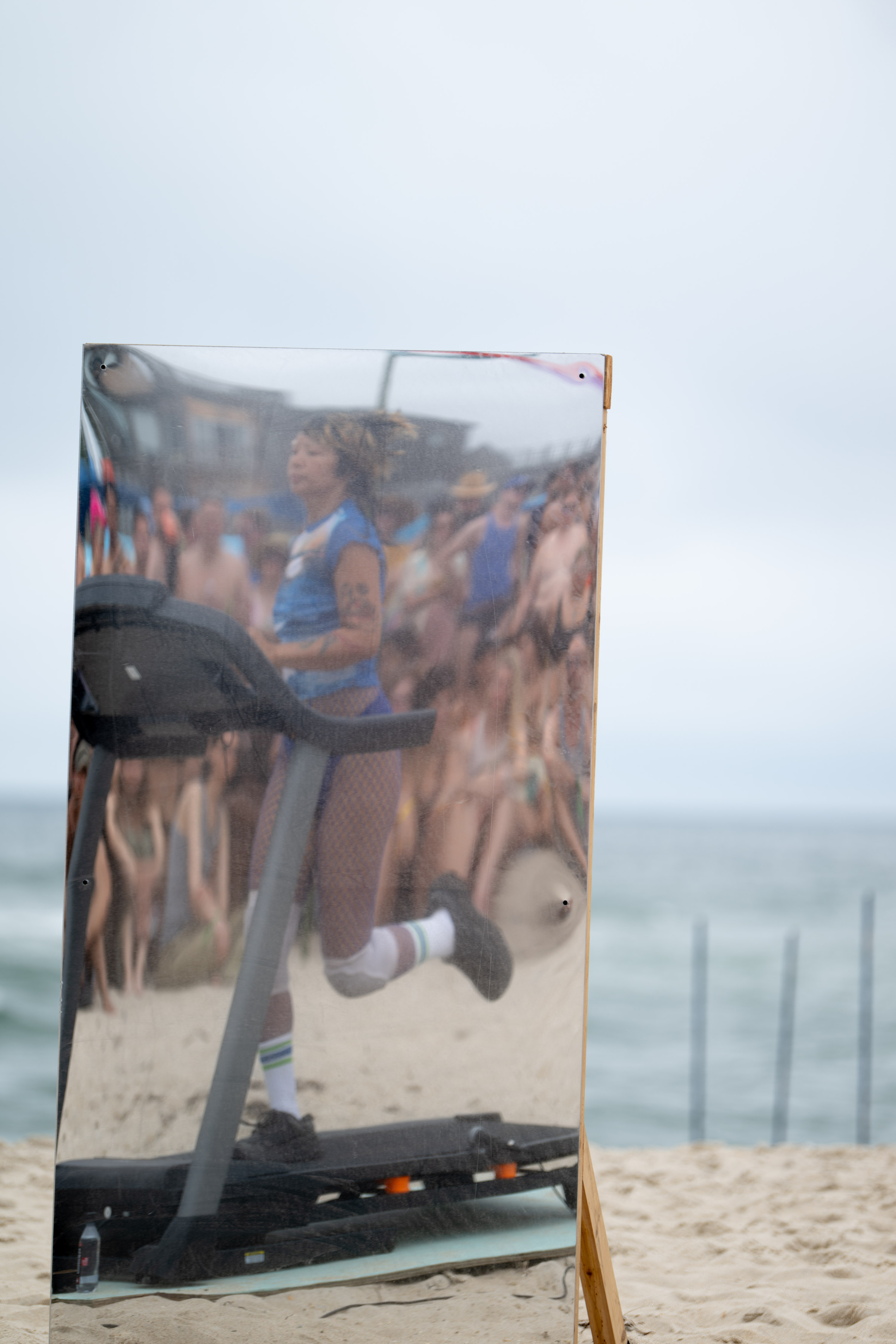 Evoking José Esteban Muñoz’s opening line of Cruising Utopia, “Queerness is not yet here,” Jas Lin invites Fire Island to orient toward the horizon beyond the island’s surfaces, enclosures, flags, and boardwalks. Lin utilizes the treadmill to chase the ecstasy of a runner’s high– stepping out of straight, linear time to draw new desire lines that lead us beyond the confines of the beaten path. In an increasingly surveilled world that even surveils the way we walk, this performance serves as a practice ground for rehearsing possibility while evading legibility. If ekstasis– the Greek root of ecstasy– means to stand outside of oneself, it also gestures toward stepping into the infinite potential of becoming. Dancing on the shoreline, how can we embody the horizon, one step after the other?