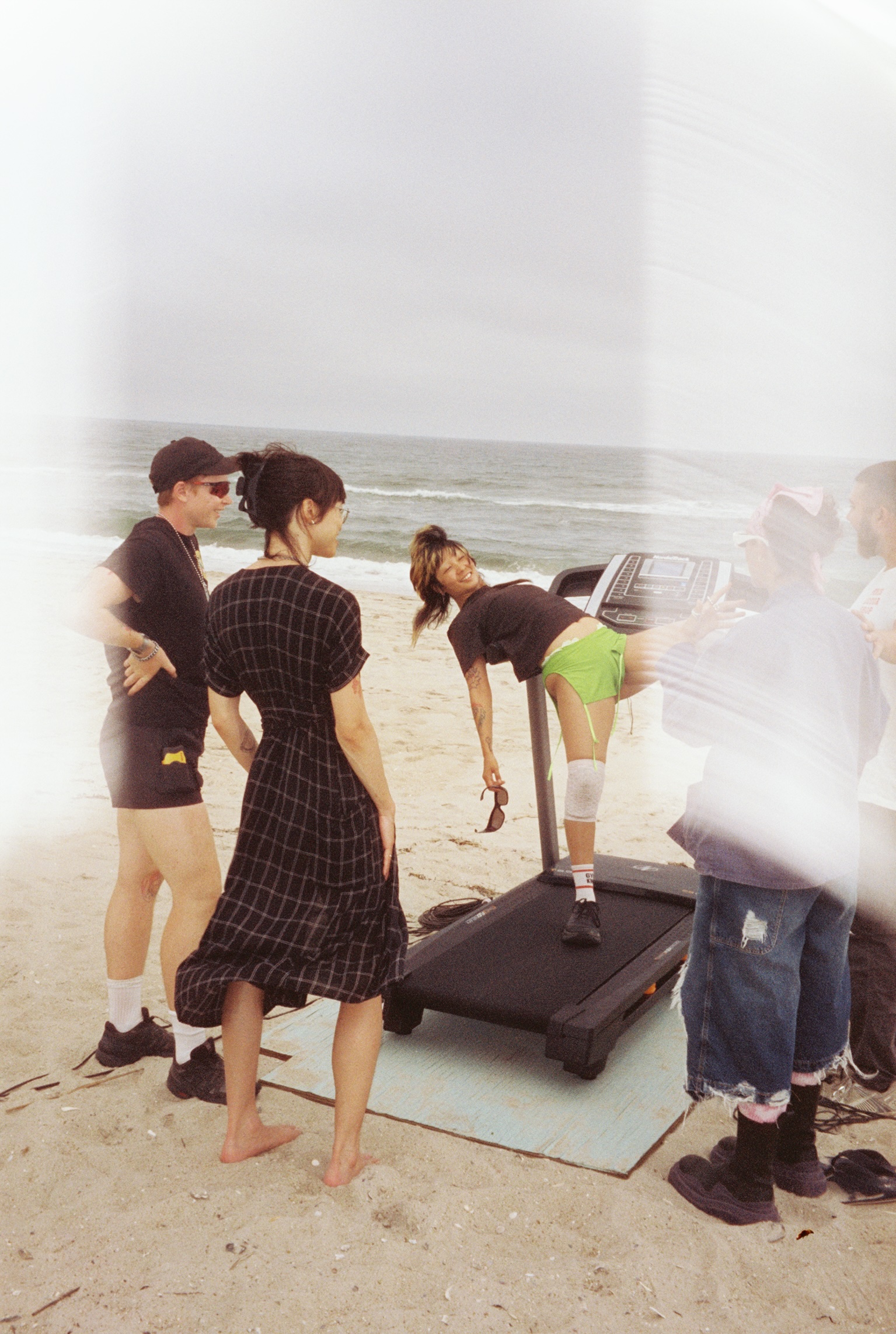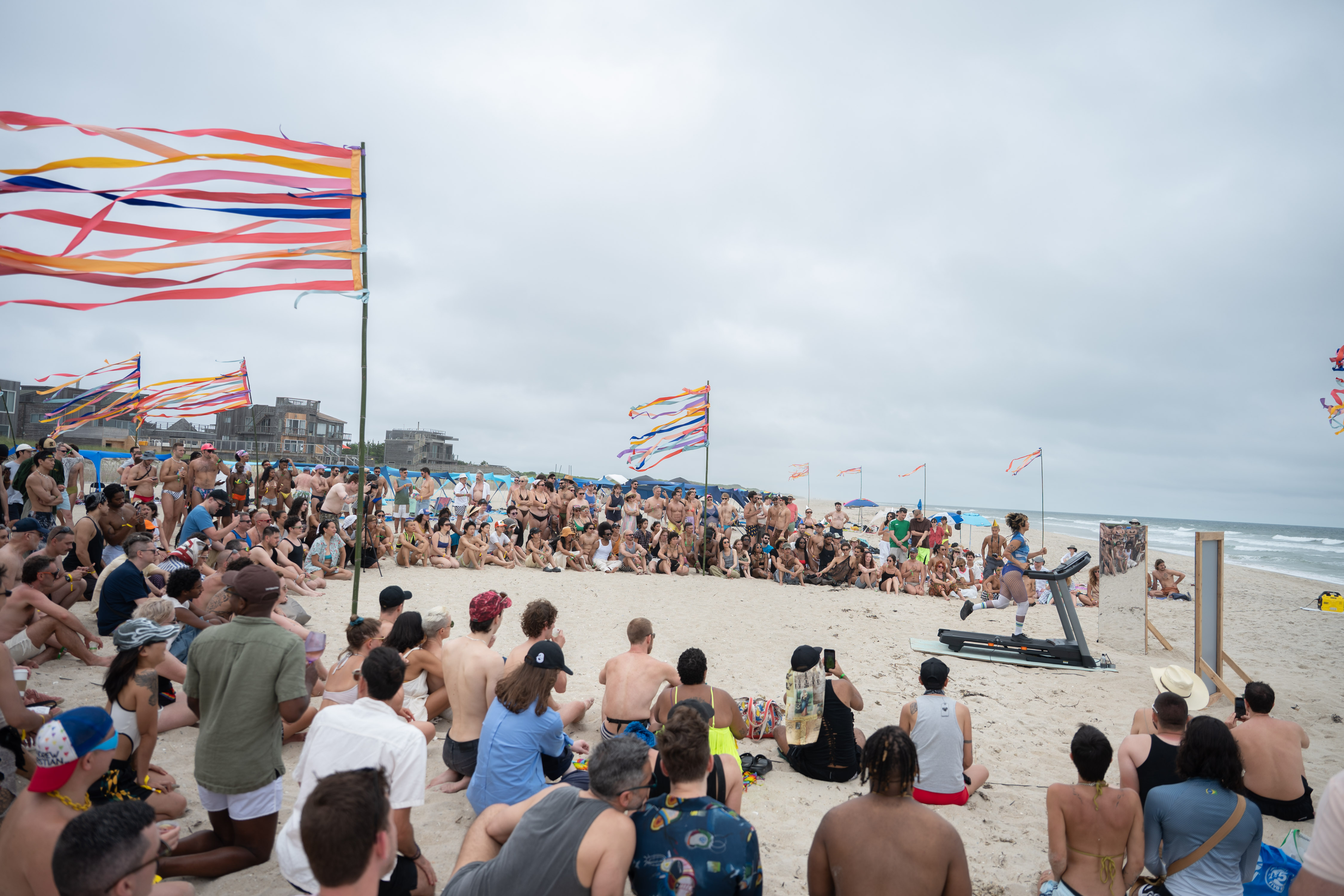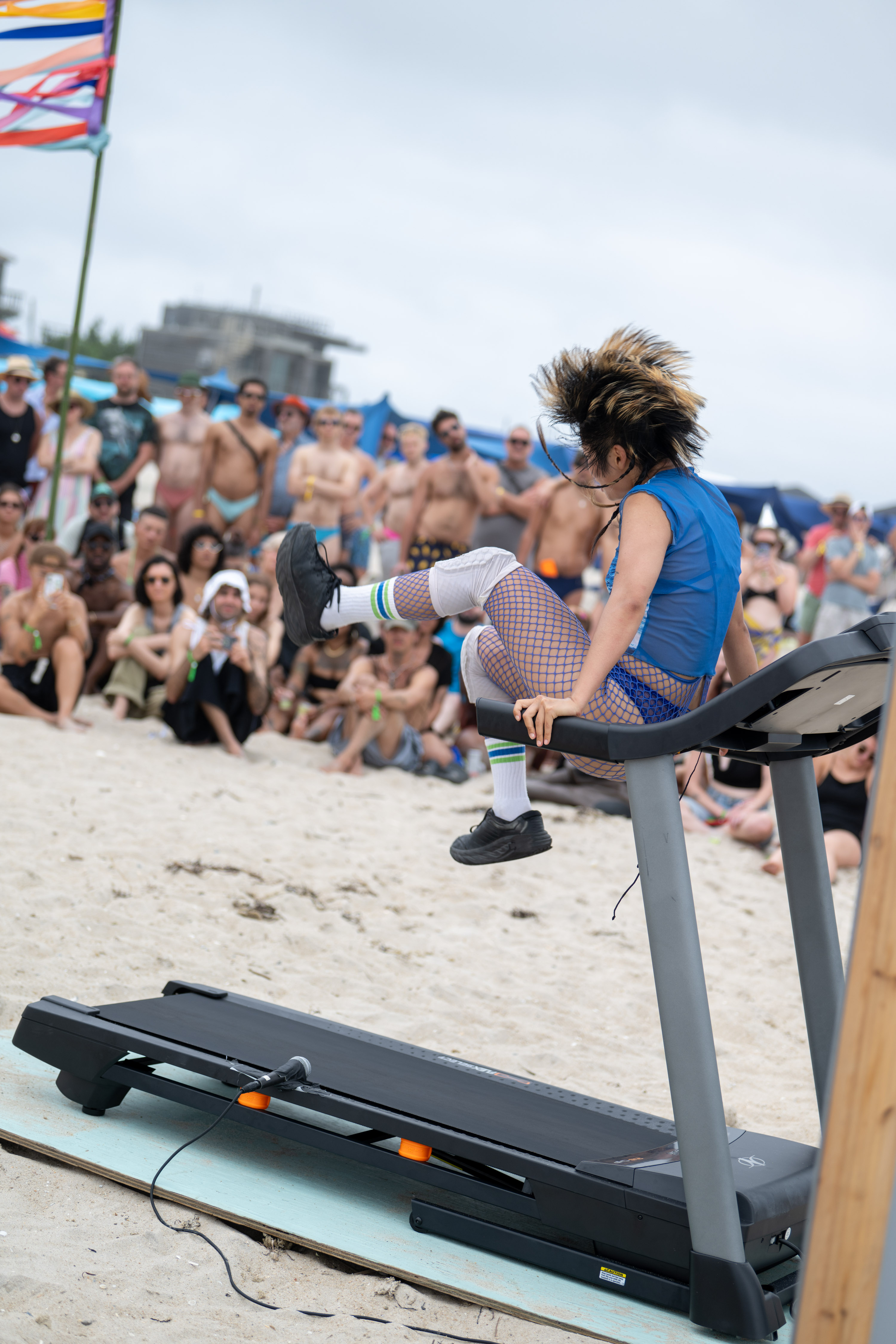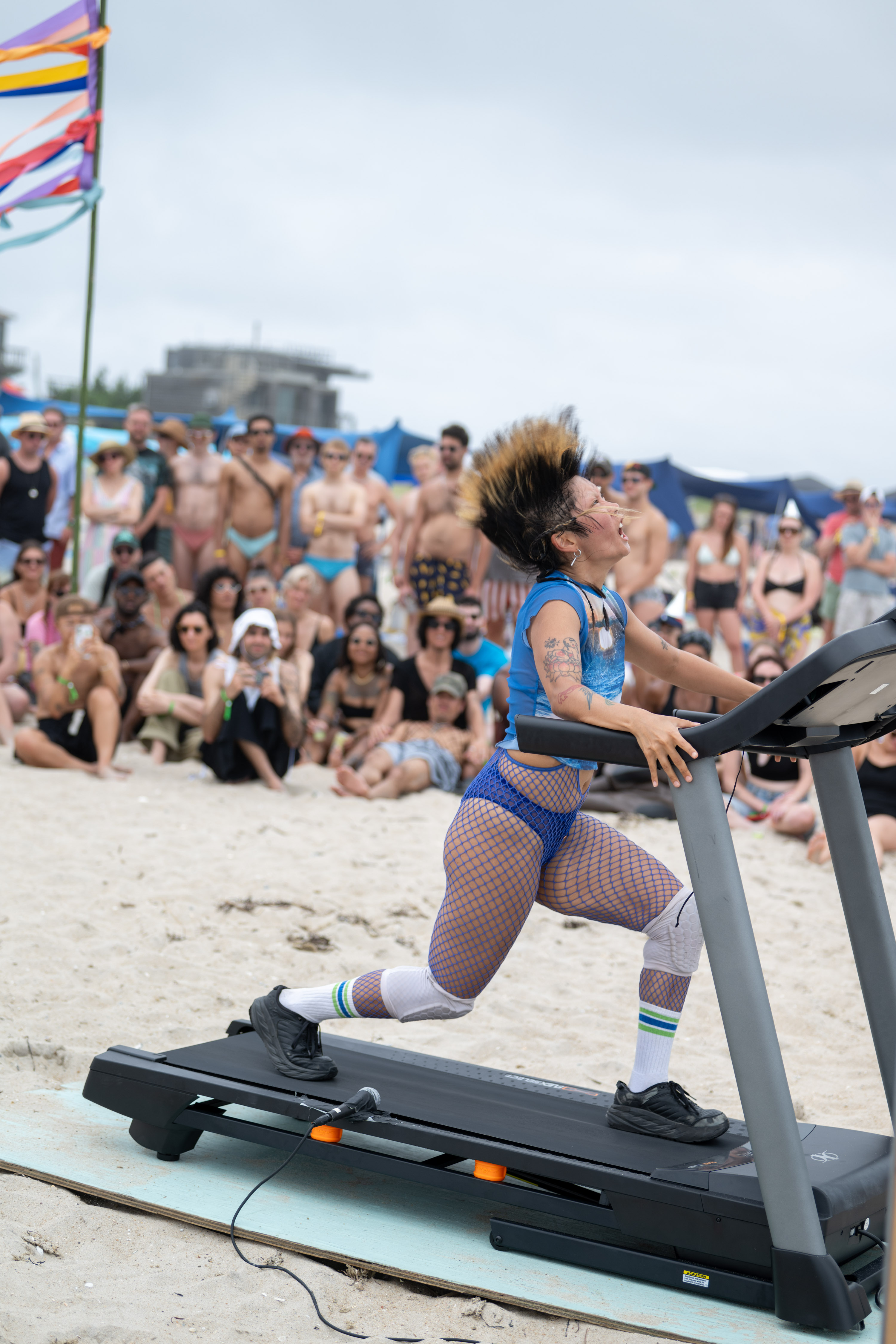Evoking José Esteban Muñoz’s opening line of Cruising Utopia, “Queerness is not yet here,” Jas Lin invites Fire Island to orient toward the horizon beyond the island’s surfaces, enclosures, flags, and boardwalks. Lin utilizes the treadmill to chase the ecstasy of a runner’s high– stepping out of straight, linear time to draw new desire lines that lead us beyond the confines of the beaten path. In an increasingly surveilled world that even surveils the way we walk, this performance serves as a practice ground for rehearsing possibility while evading legibility. If ekstasis– the Greek root of ecstasy– means to stand outside of oneself, it also gestures toward stepping into the infinite potential of becoming. Dancing on the shoreline, how can we embody the horizon, one step after the other?