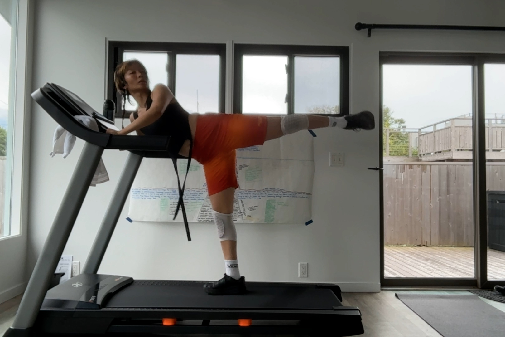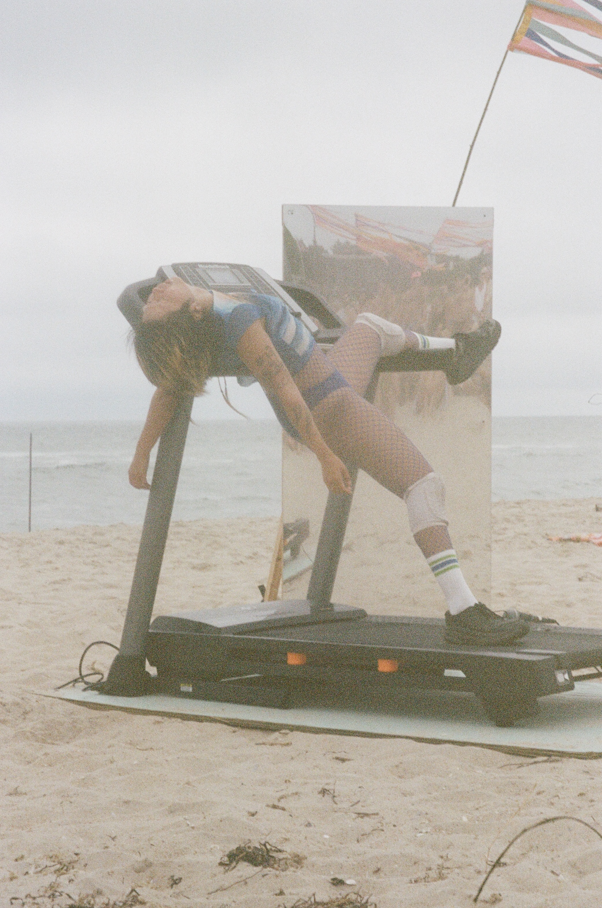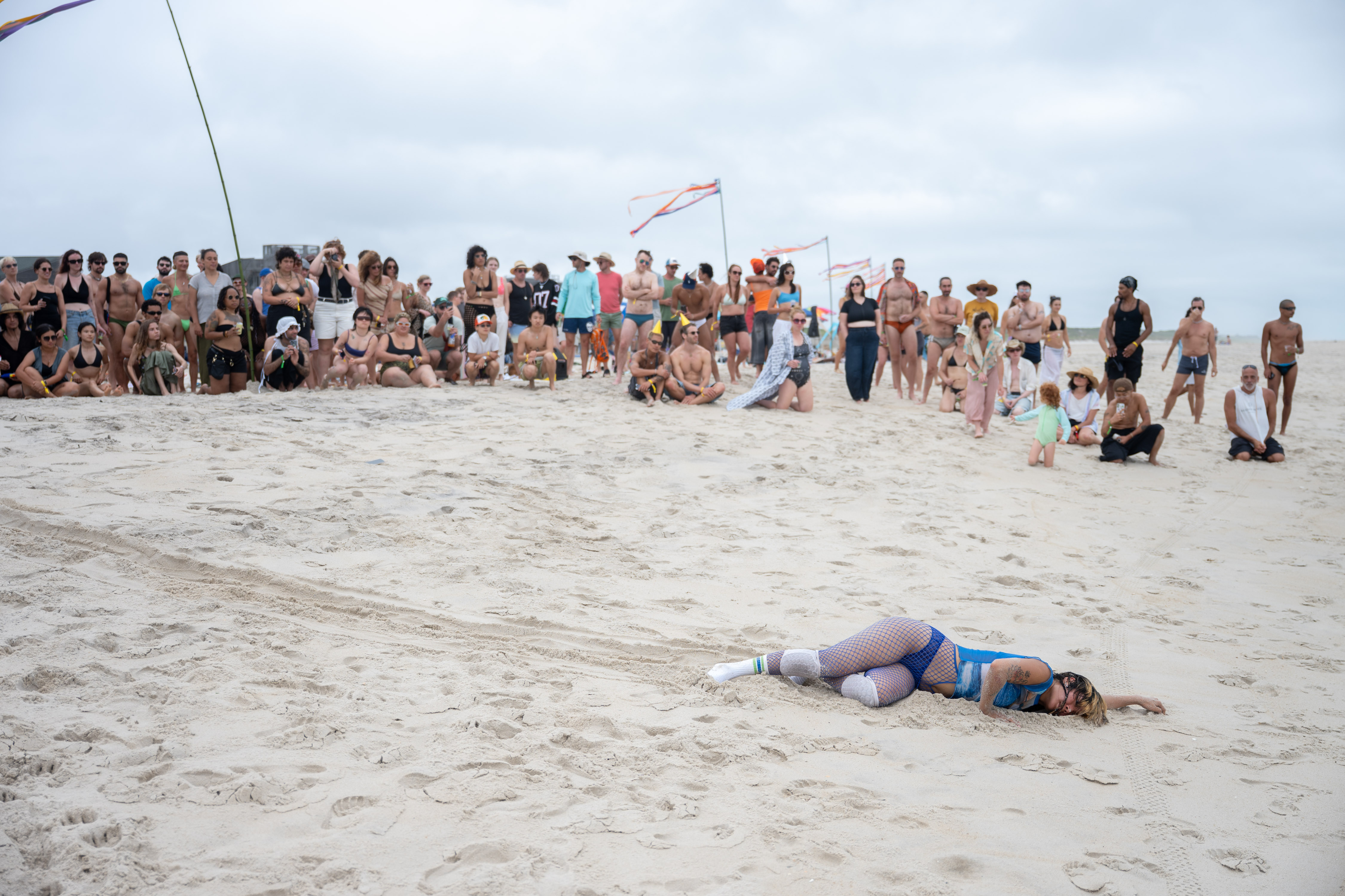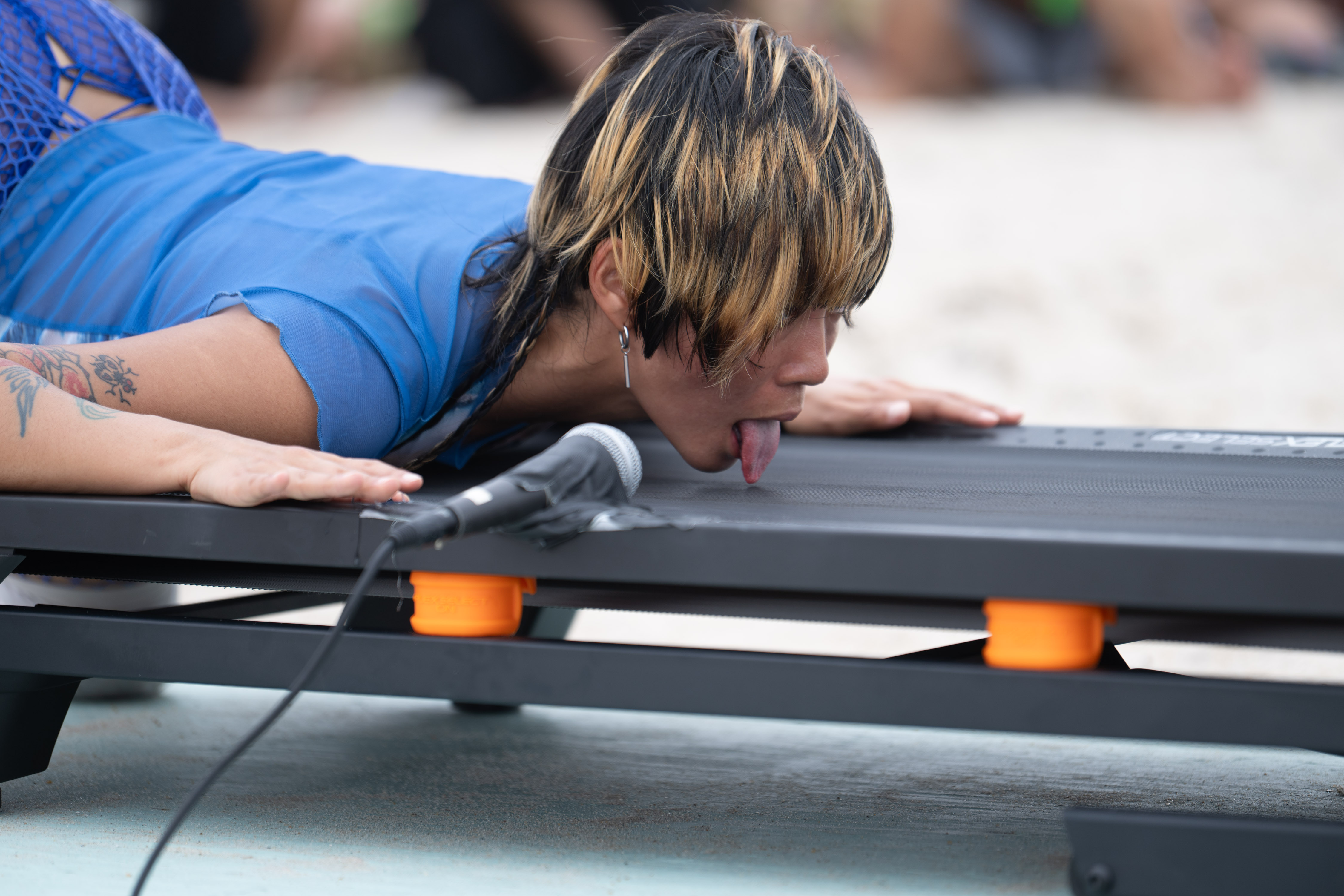 Evoking José Esteban Muñoz’s opening line of Cruising Utopia, “Queerness is not yet here,” Jas Lin invites Fire Island to orient toward the horizon beyond the island’s surfaces, enclosures, flags, and boardwalks. Lin utilizes the treadmill to chase the ecstasy of a runner’s high– stepping out of straight, linear time to draw new desire lines that lead us beyond the confines of the beaten path. In an increasingly surveilled world that even surveils the way we walk, this performance serves as a practice ground for rehearsing possibility while evading legibility. If ekstasis– the Greek root of ecstasy– means to stand outside of oneself, it also gestures toward stepping into the infinite potential of becoming. Dancing on the shoreline, how can we embody the horizon, one step after the other?
