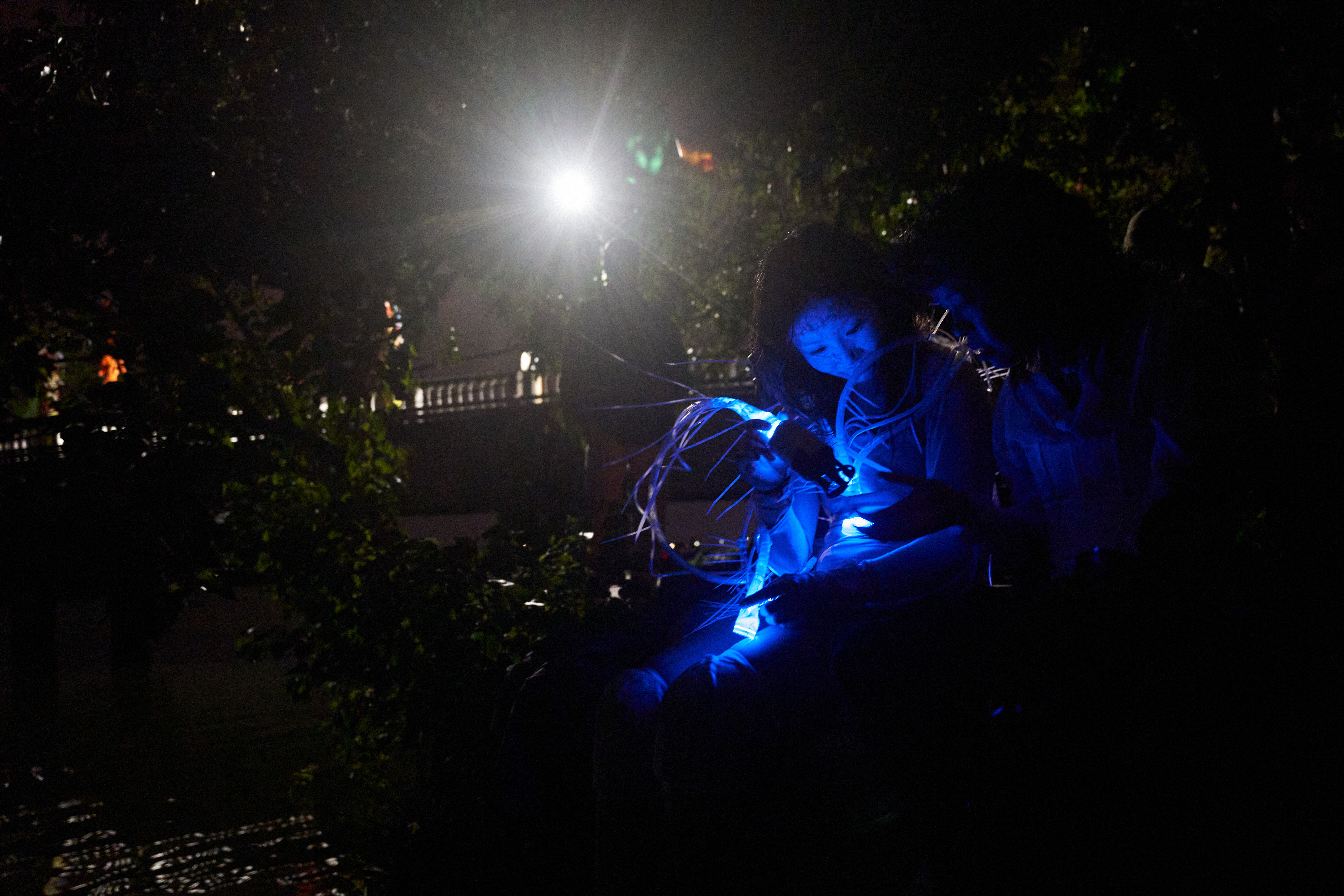 Named after the stinging cells of jellyfish and other cnidarians, NEMATOCYST is an excavation of a potent force of aliveness, a venomous injection of love and liberation. A glowing jellyfish creature (MUCK) lures the audience into a collective altered state through a DJ set by Hearthealer, and then guides them back through breath.