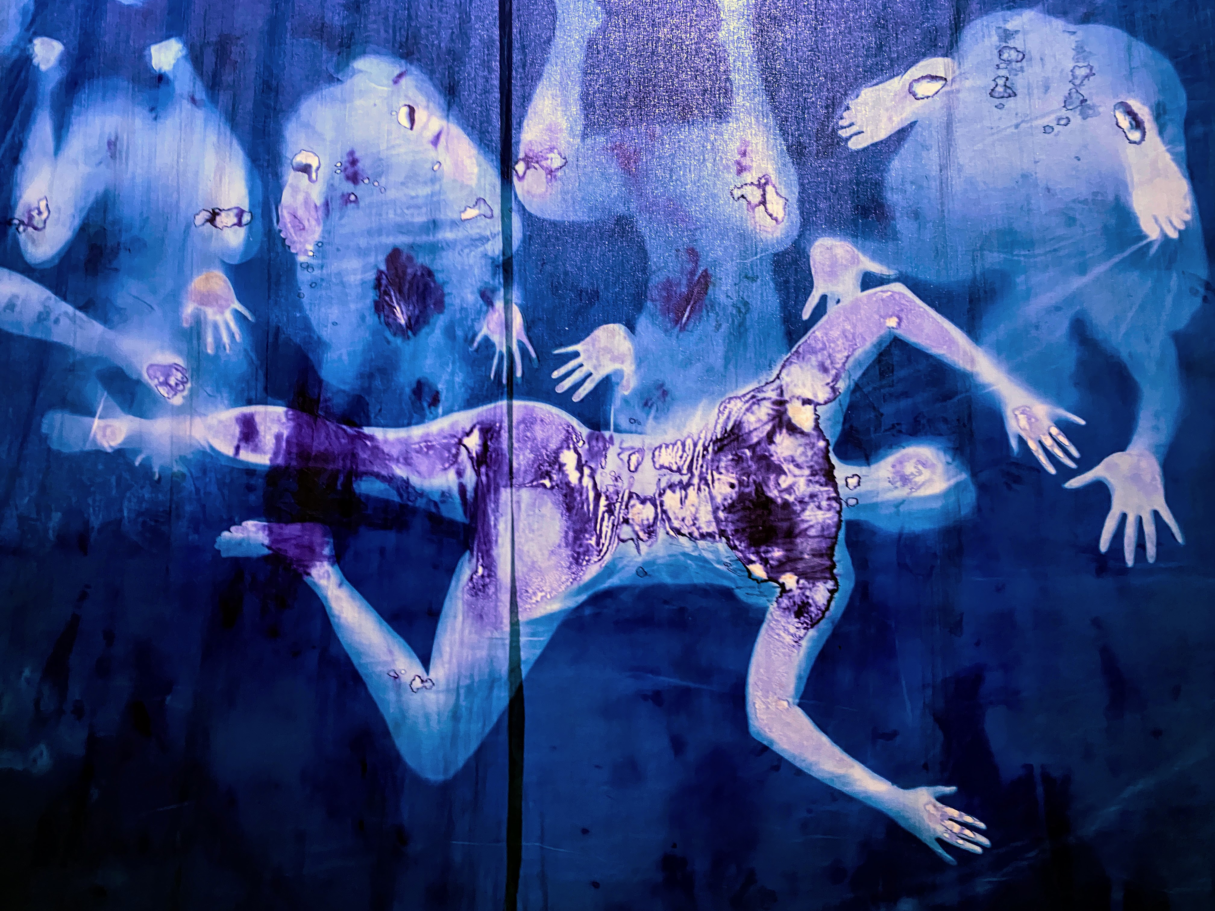 Against an unprecedented backdrop of US-based anti-trans legislation Human Measure asks: how do we manifest empowerment, sensuality and self actualization in a society that actively tries to erase us? Insisting upon plurality and avoiding legibility, Human Measure straddles dance and the history of photography. The work is purposefully designed to be difficult to see and is staged in low levels of red light found in photographic darkrooms. The viewer’s physiology is hijacked as live after images are seared into the audience’s retina by a massive flashing light box, culminating in the active development of one of the world’s largest cyanotypes, on stage in real time.