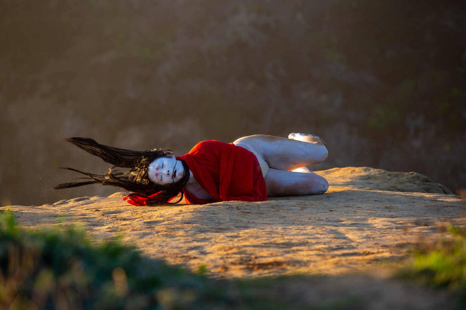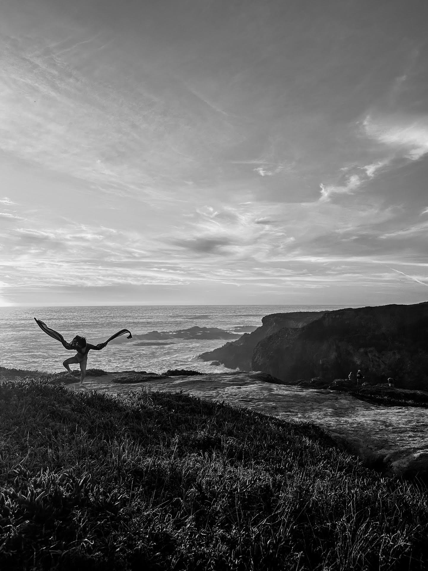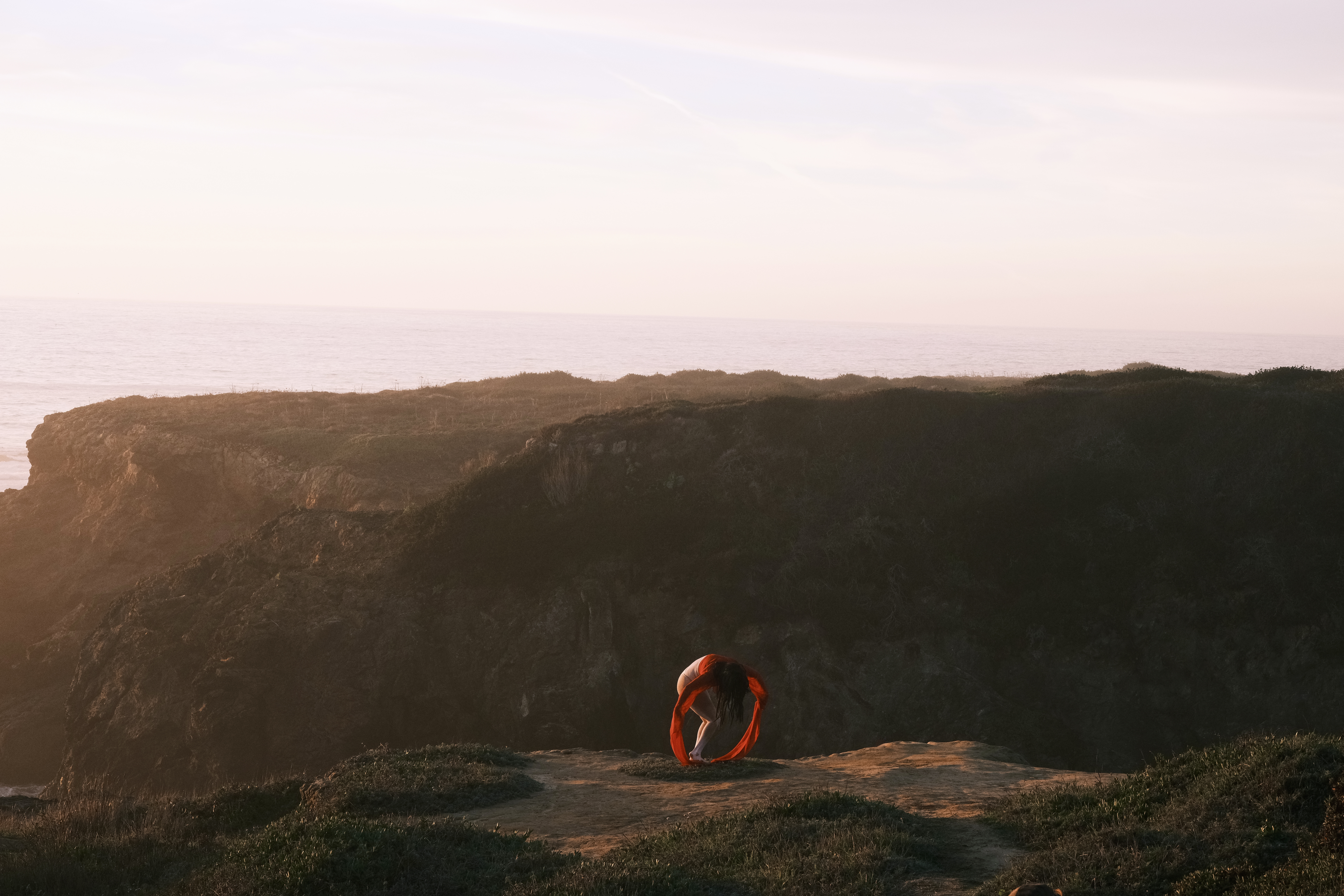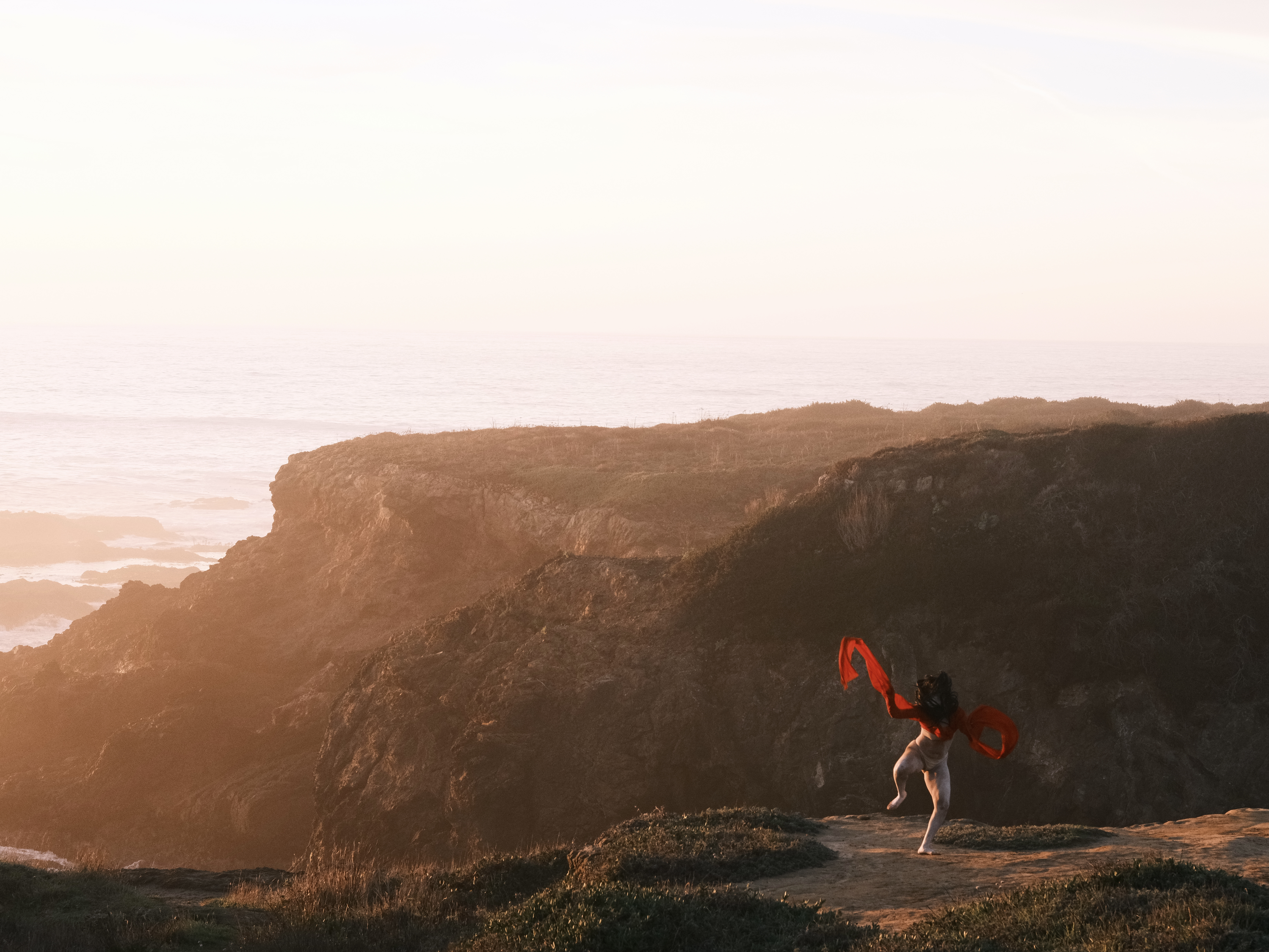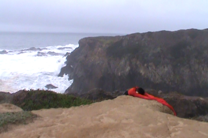 The sea goat mirrors the land in a reciprocal topography, dwelling at the threshold between ocean and mountain, night and day, death and life, the unseen and the seen. It finds resonance in stillness and slowness, listening as bells dissolve into the wind and become a continuous reverberation of lineage and futurity. Lin’s red sleeves unspool time, stitching together cycles of loss and fertility, holding and releasing, remembering and resurfacing. Inspired by the rising and falling of the tides and the mythical goats of Goat Island that belong(ed) to no one, [sea goat] initiates a passage through the arched gateways of the Mendocino Headlands.