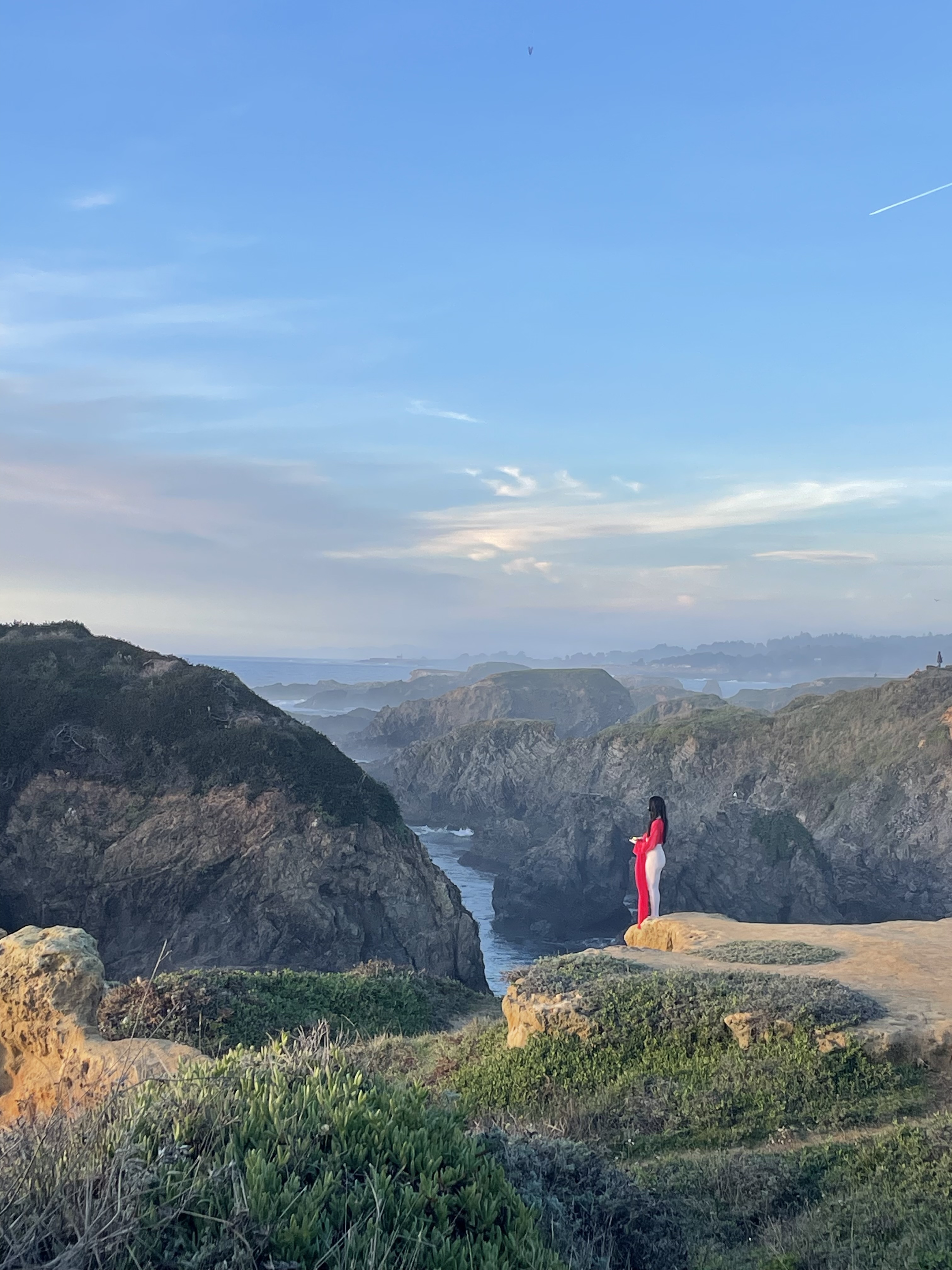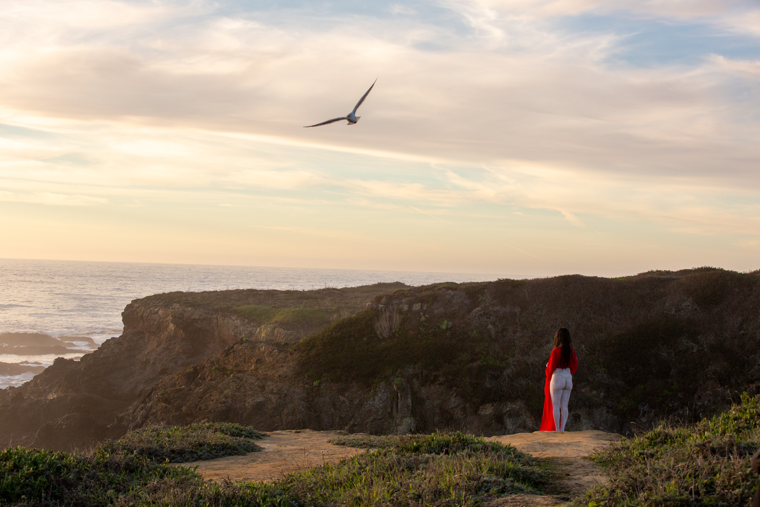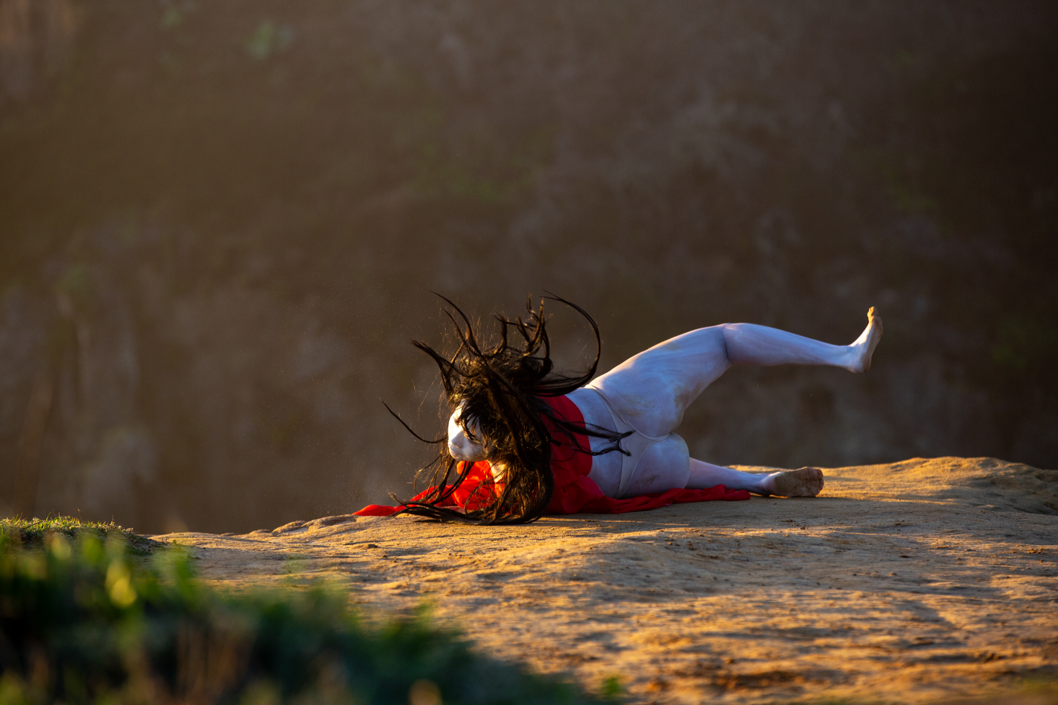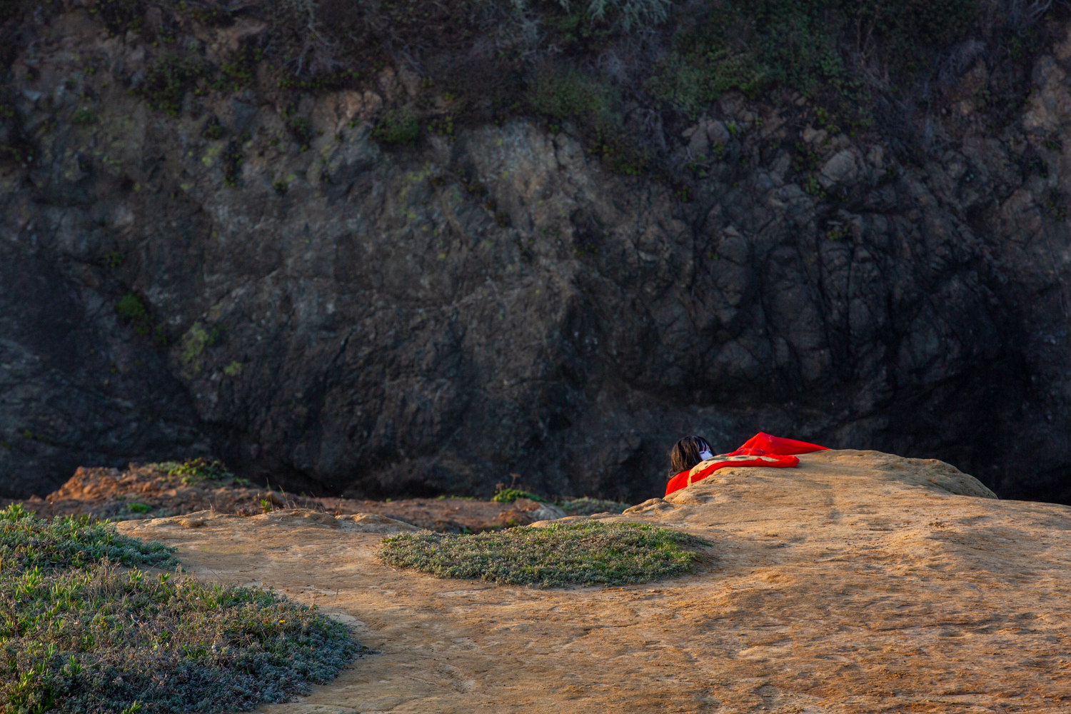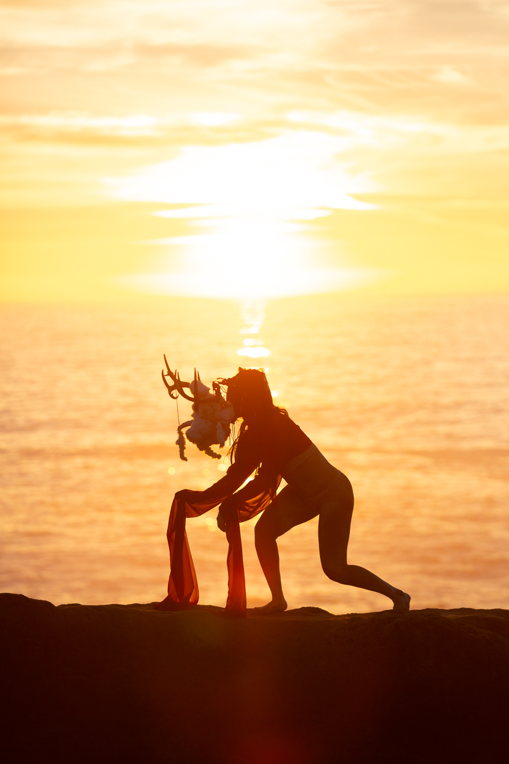 The sea goat mirrors the land in a reciprocal topography, dwelling at the threshold between ocean and mountain, night and day, death and life, the unseen and the seen. It finds resonance in stillness and slowness, listening as bells dissolve into the wind and become a continuous reverberation of lineage and futurity. Lin’s red sleeves unspool time, stitching together cycles of loss and fertility, holding and releasing, remembering and resurfacing. Inspired by the rising and falling of the tides and the mythical goats of Goat Island that belong(ed) to no one, [sea goat] initiates a passage through the arched gateways of the Mendocino Headlands.